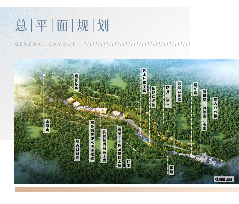 項目概況 :項目總用地面積約129畝,建、構筑物占地約5.2畝,其中新建建、構筑物占地2390.02㎡,利舊建、構筑物占地1091.91㎡,建成后建構筑物總建筑面積3701.08㎡。廠區建筑密度3.736%,容積率0.0403,綠地率83%,綠地面積71542.43㎡。通過分析周邊道路交通條件,結合各功能單元基本要求,按照該項目的生產工藝及管理要求,廠區共形成辦公配套區、生產區、原料倉儲區。